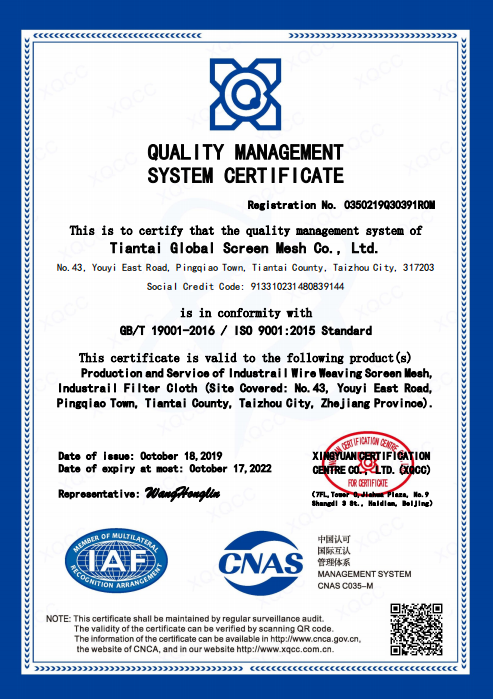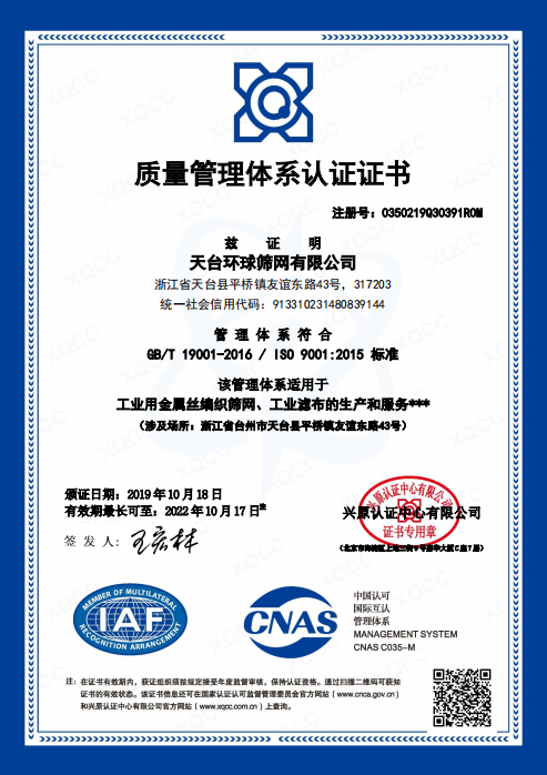 天臺環(huán)球篩網有限公司,成立于1995年,座落在東海之濱美麗的天臺山腳下,注冊資金500萬人民幣,公司已通過ISO9001:2015國際質量體系認證。經過環(huán)球人的不斷努力,目前公司已擁有標準廠房10,000平方米,各種篩網設備近100臺,員工100余人,其中高中級科研及管理人員10人,公司產品主要有:不銹鋼網,銅網,電焊網,電焊網片,軋花網,不銹鋼延伸產品,單復絲濾布,濾布袋,壓濾機袋等。